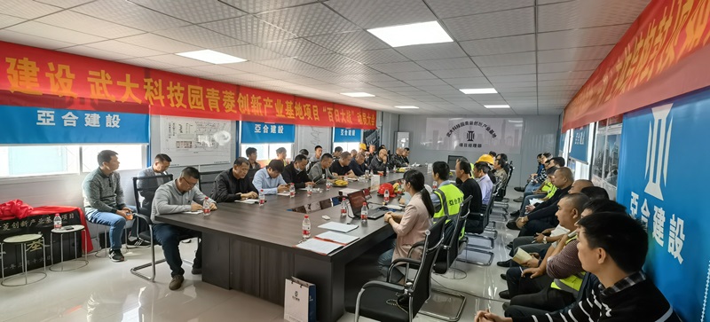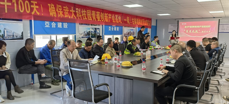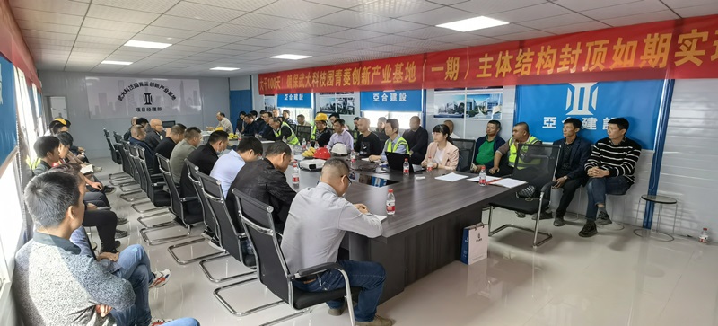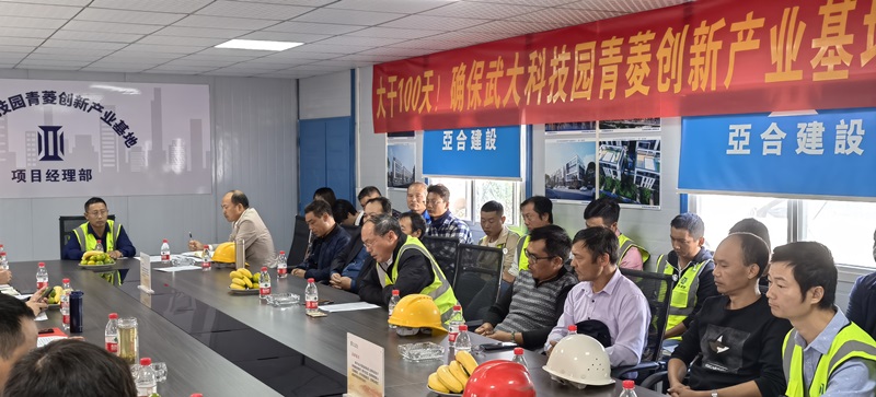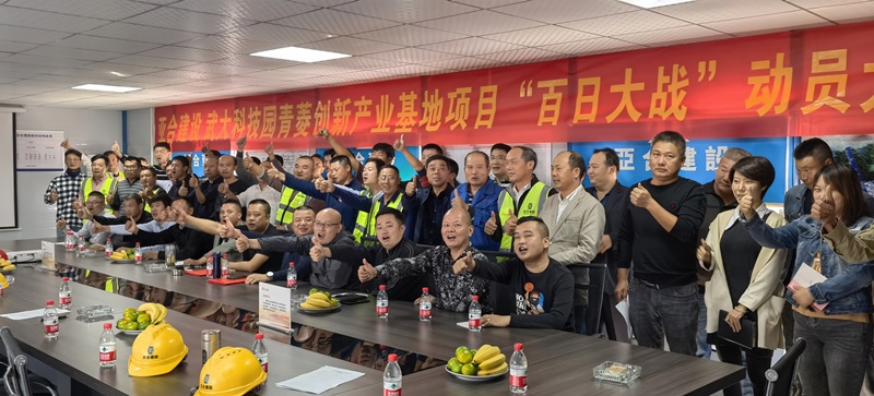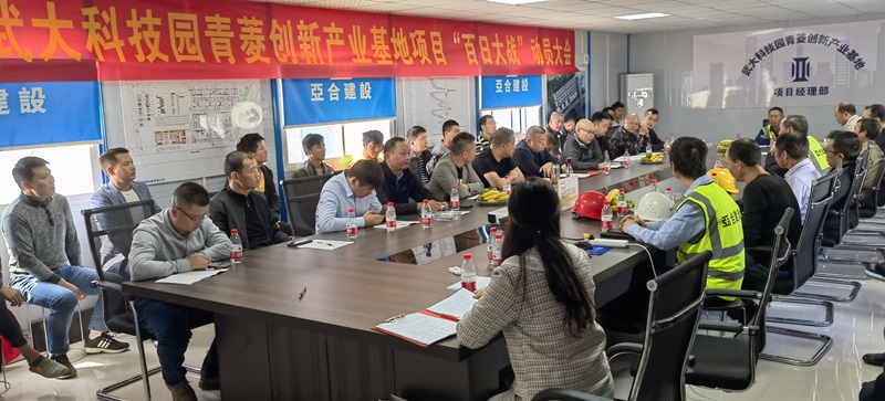 2021年10月12日上午11時,湖北亞合建設在武大產業園青菱創新產業基地項目部會議室組織召開“百日大戰”動員大會。該會議由亞合建設行政部召開主持,并邀請甲方楚朗公司領導、亞合建設董事長、總經理、工程副總、商務副總、安環經理、采購經理、和平項目經理、塔子湖項目經理、大橋項目經理、青菱項目一工區、二工區項目經理、項目管理人員、勞務班組、施工員等五十余人參加,會議明確了100天的項目進度計劃、施工方案及獎懲措施,以保證武大科技園青菱創新產業基地(一期)主體結構百日封頂目標如期實現。